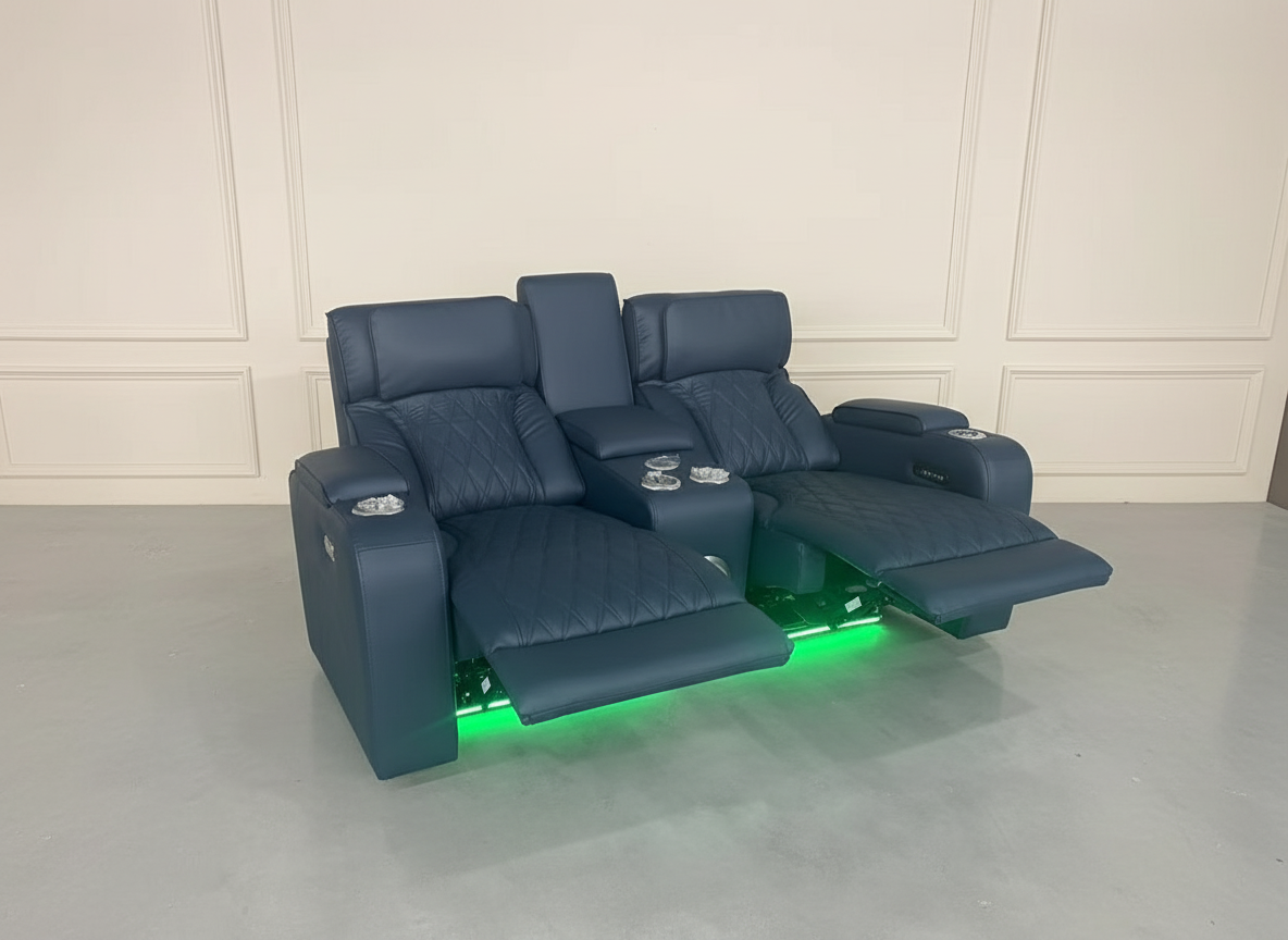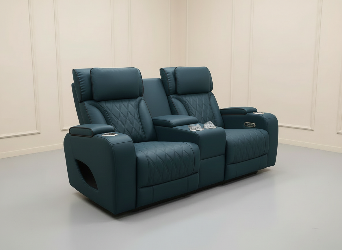 Home theater setups, apartments, and anyone looking for a dark teal blue power reclining loveseat with console and cup holders.