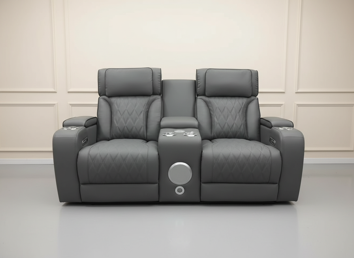 At the center, the loveseat features a built-in center console with cup holders and storage, plus a speaker detail on the front for a sleek, high-end look. Finished with diamond-stitched upholstery and supportive cushioning, the Isabella loveseat delivers a modern aesthetic with comfort you’ll love.